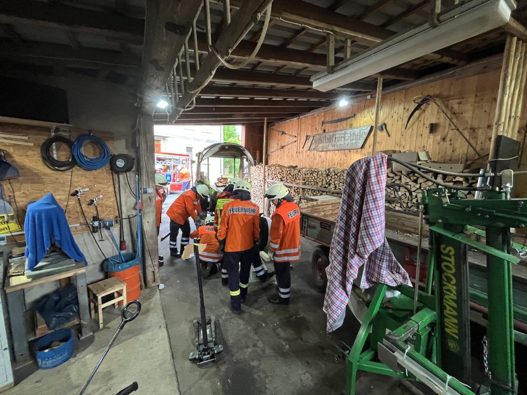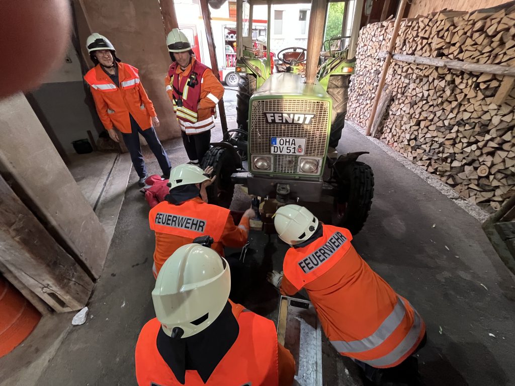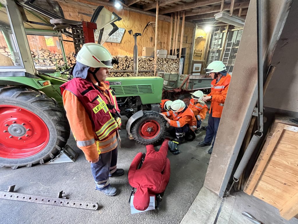 Nach kurzer Zeit war alles vorbereitet und der Traktor konnte angehoben und die Person befreit werden. Im Realeinsatz hätte es eine enge Absprache mit dem Rettungsdienst bei der Rettung gegeben.