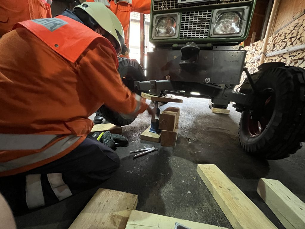 Nach der Lageerkundung wurde zunächst die Einsatzstelle abgesichert und Sicherungsmaßnahmen am Fahrzeug durchgeführt. Der Traktor wurde gegen Wegrollen gesichert, mittels Wagenheber/Büffelheber wurde das Anheben des Fahrzeuges vorbereitet und Rüstholz zum Unterbauen bereit gelegt. Ein wichtiger Grundsatz bei Anheben von Lasten ist das ständige Unterbauen selbiger, um ein ungewolltes Absacken zu vermeiden. Außerdem wurde die verunfallte Person ständig betreut.