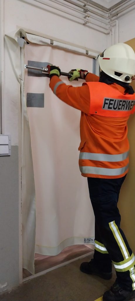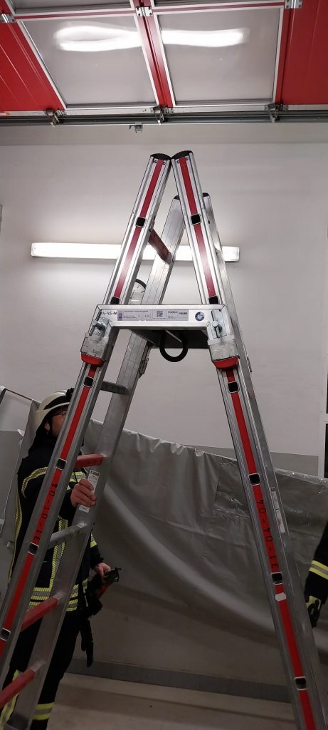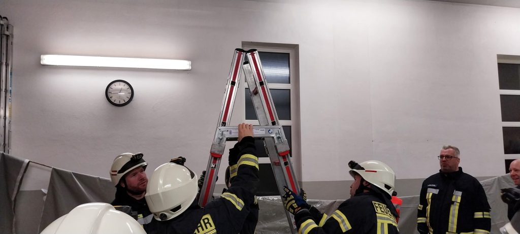 Die Dienstagsgruppe übte den Umgang mit neuem Gerät. Zum Einen wurde der unlängst gespendete Rauchvorhang ausprobiert und die einsatztaktischen Grundsätze besprochen. Dann galt es das neu beschaffte Steckleiter-Verbindungsteil auszuprobieren. Mit diesem Gerät lässt sich aus der auf dem LF 10 verlasteten vierteiligen Steckleiter eine Bockleiter bauen. Auch hier wurden die Einsatzmöglichkeiten besprochen.