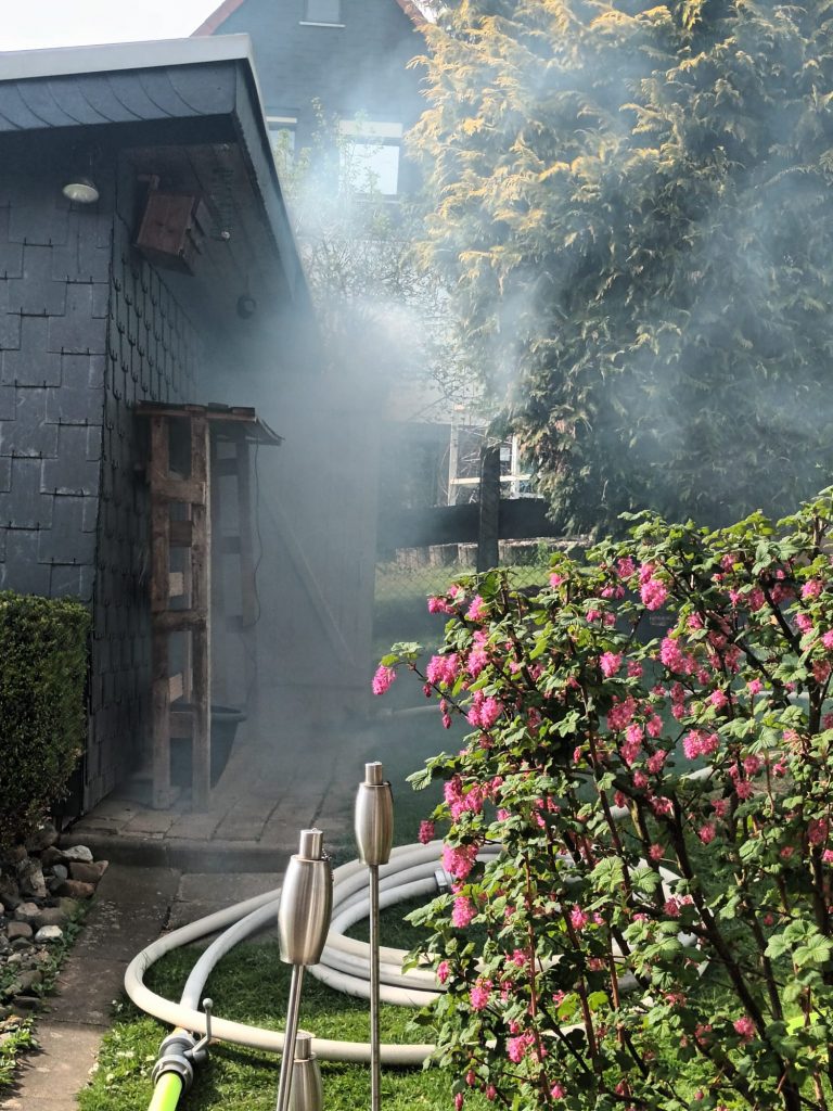 Dort galt es den zweiten Teil der Frühjahrsübung abzuarbeiten. In einer Gartenhütte kam es zu einer starken Rauchentwicklung, überdies wurde eine Person vermisst. Sofort wurde die Menschenrettung durch den Angriffstrupp unter Atemschutz durchgeführt. Die Brandbekämpfung erfolgte dann über zwei C-Rohre. Nach „Feuer aus“ brachte ein weiterer Trupp den Hochdrucklüfter in Stellung. Somit war auch dieser Teil der Übung abgearbeitet.