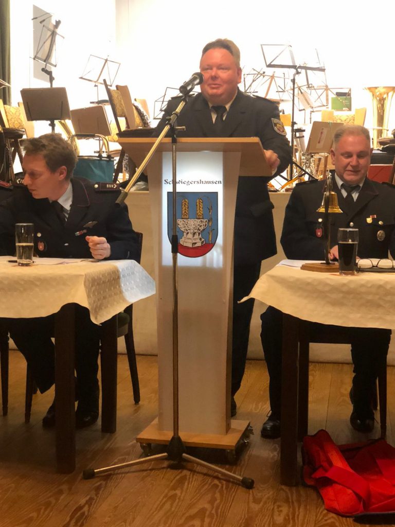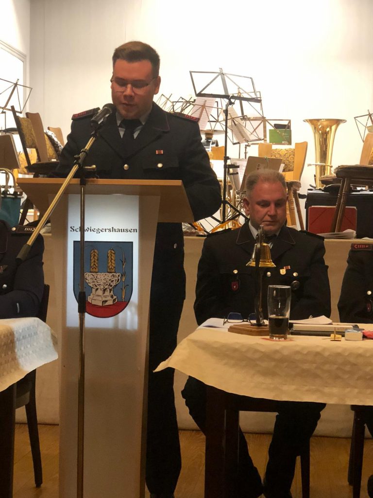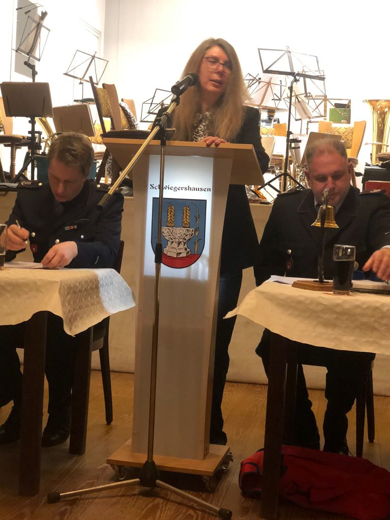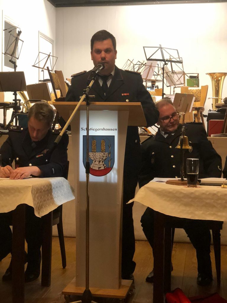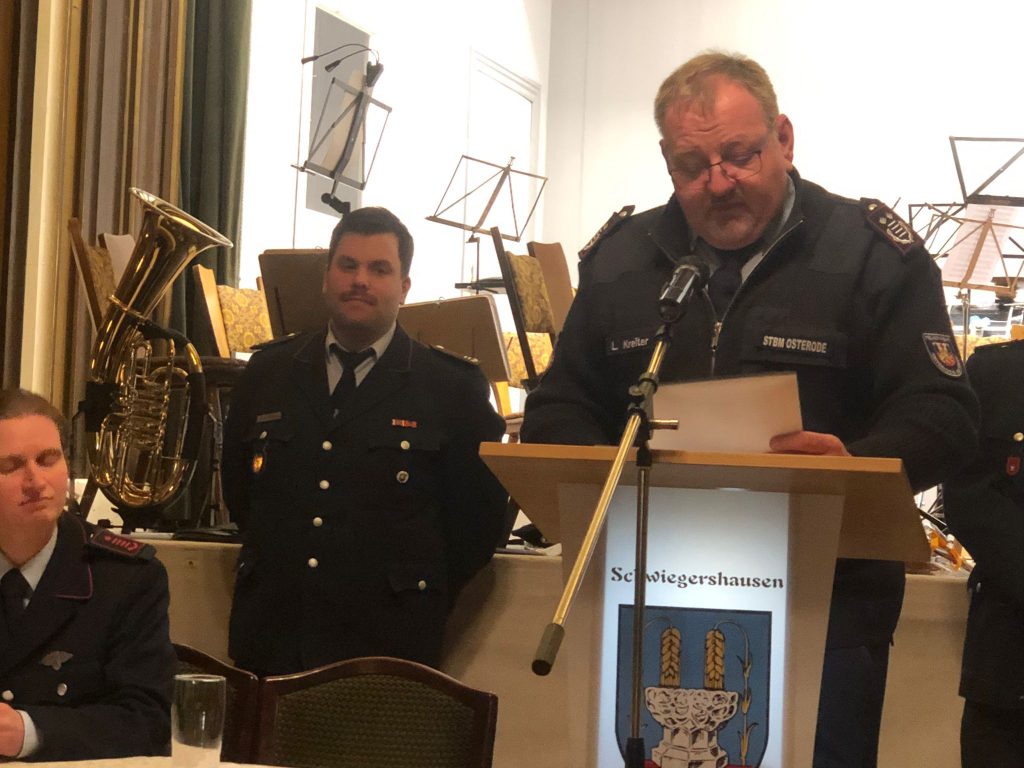 In Ihren Grußworten dankten Bürgermeister Augat und Ortsbürgermeisterin Schrader der Ortsfeuerwehr Schwiegershausen für die geleistete Arbeit im Jahr 2026. Augat konnte die Versammlung darüber informieren, dass die Stadt Osterode viel Geld in ihre Freiwillige Feuerwehr investiert, was u.a. durch den bevorstehenden Bau des gemeinsamen Gerätehauses der Ortswehren Förste und Nienstedt deutlich wird. Kathrin Schrader thematisierte den Großbrand der ehemaligen Gastwirtschaft „Zur Linde“ sowie die in Eigenregie durchgeführte Neuanschaffung eines Mehrzweckfahrzeuges. Kamerad Markus Herzberg nahm erstmals an einer Versammlung in Schwiegershausen teil und sprach von aktuellen Themen die die Kreisfeuerwehr sowie den Kreisfeuerwehrverband betreffen. So konnte er betonen, dass der Bau der neuen FTZ bei Ebergötzen aktuell voll im Bau- und Kostenrahmen liegt.