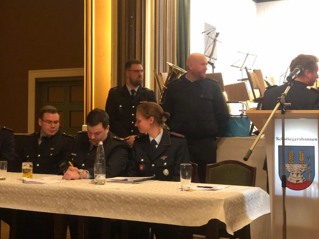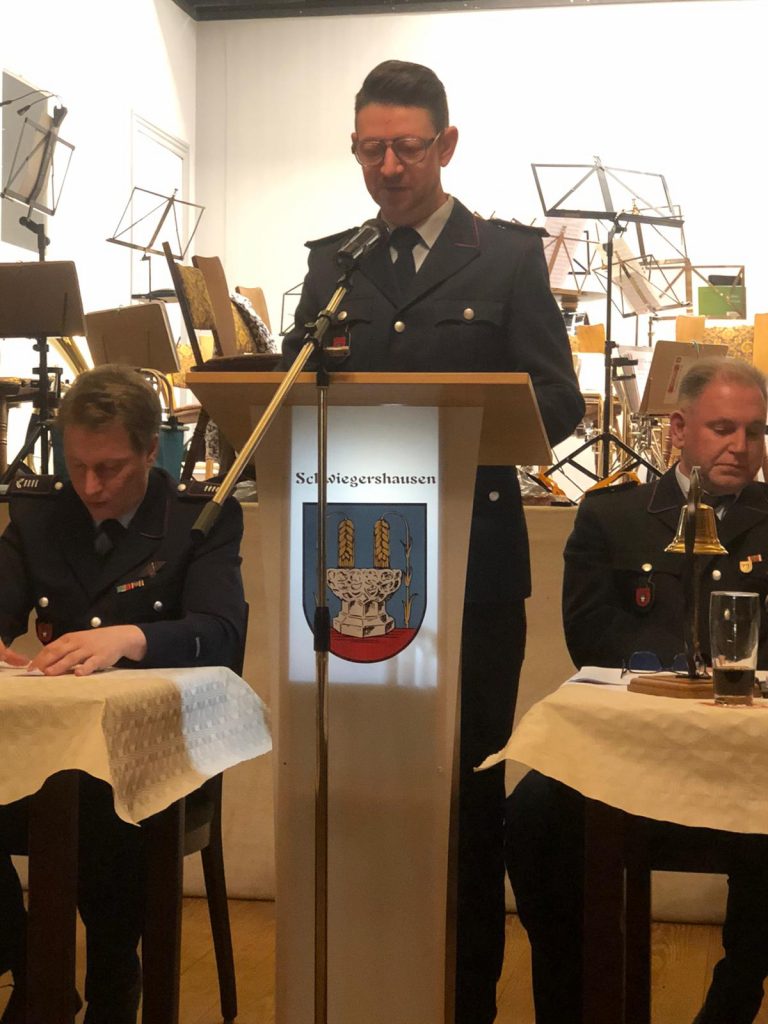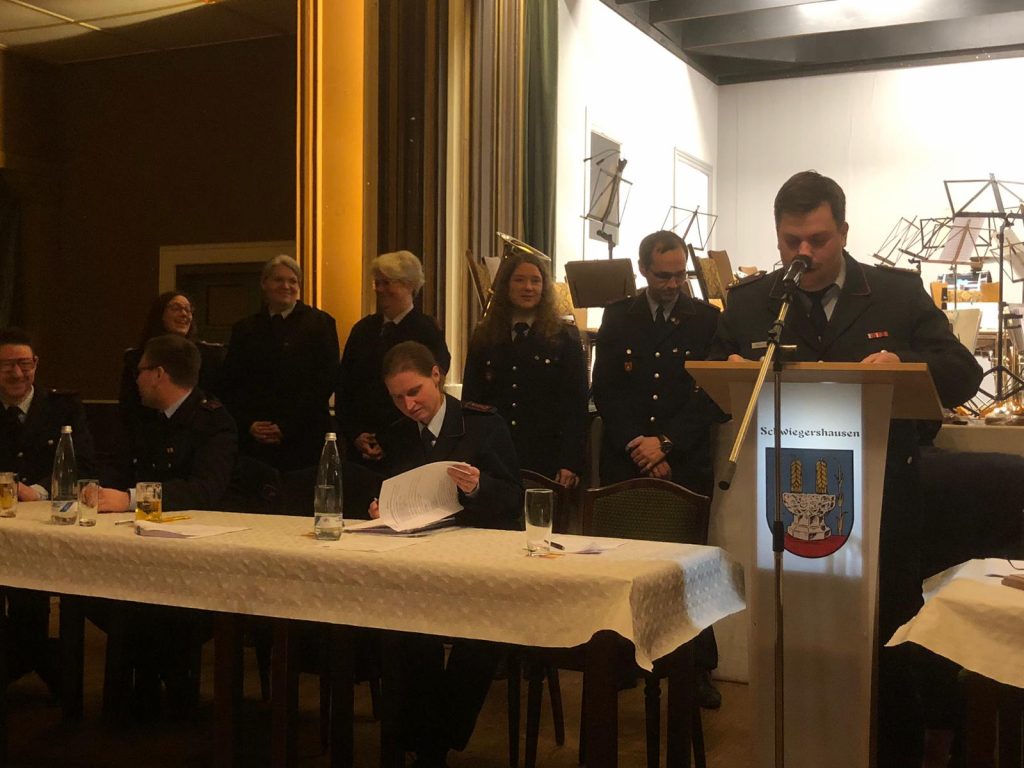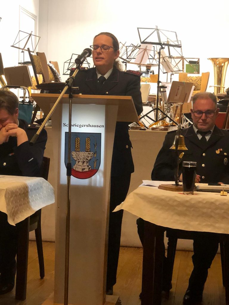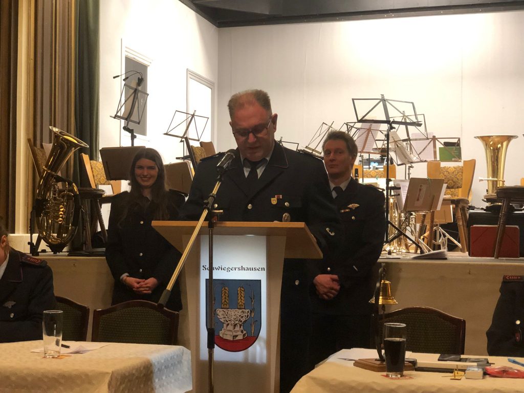 In Ihren Grußworten dankten Bürgermeister Augat und Ortsbürgermeisterin Schrader der Ortsfeuerwehr Schwiegershausen für die geleistete Arbeit im Jahr 2026. Augat konnte die Versammlung darüber informieren, dass die Stadt Osterode viel Geld in ihre Freiwillige Feuerwehr investiert, was u.a. durch den bevorstehenden Bau des gemeinsamen Gerätehauses der Ortswehren Förste und Nienstedt deutlich wird. Kathrin Schrader thematisierte den Großbrand der ehemaligen Gastwirtschaft „Zur Linde“ sowie die in Eigenregie durchgeführte Neuanschaffung eines Mehrzweckfahrzeuges. Kamerad Markus Herzberg nahm erstmals an einer Versammlung in Schwiegershausen teil und sprach von aktuellen Themen die die Kreisfeuerwehr sowie den Kreisfeuerwehrverband betreffen. So konnte er betonen, dass der Bau der neuen FTZ bei Ebergötzen aktuell voll im Bau- und Kostenrahmen liegt.