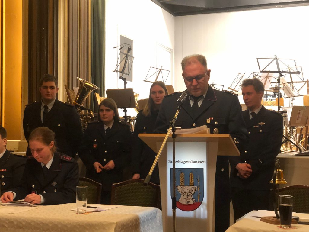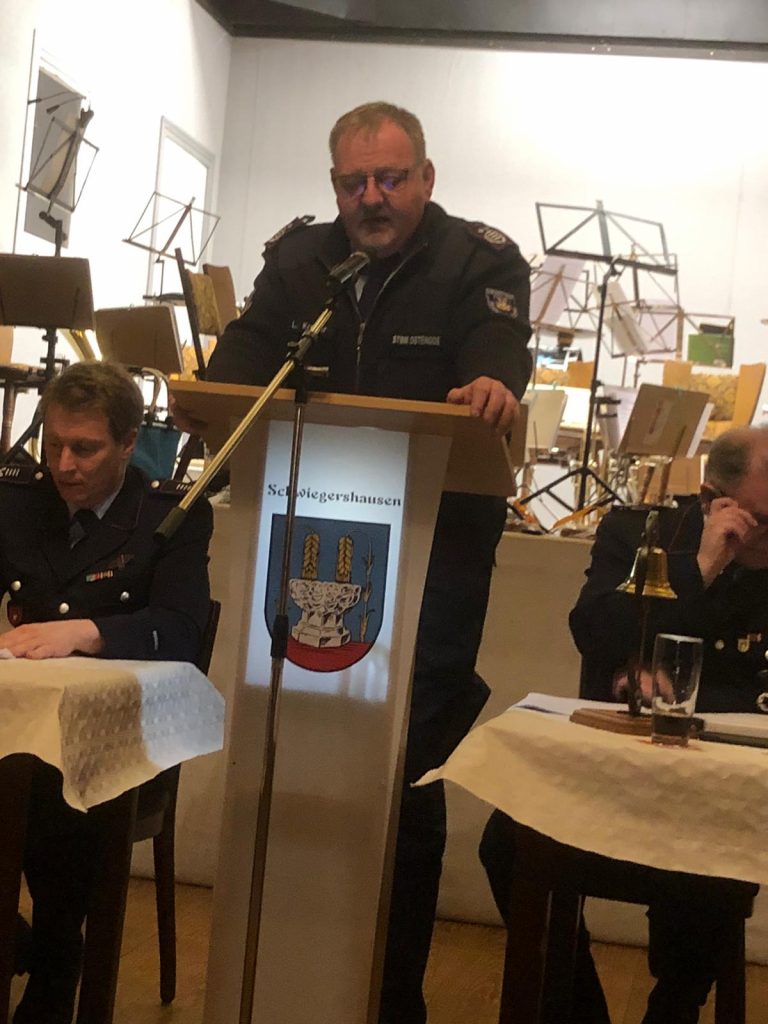 Stadtbrandmeister Lars Kreiter ging auf die Umstellung der Dienstgrade und der Dienstkleidung gemäß Novellierung der Niedersächsischen Feuerwehrverordnung ein. Während die Mannschaftsdienstgrade (Feuerwehrmann-Anwärter bis Erster Hauptfeuerwehrmann) gleich bleiben, gibt es die Laufbahn der „Löschmeister“ nicht mehr. Diese heißen jetzt „Brandmeister“. Aus den bisherigen Brandmeistern werden „Brandinspektoren“. Die Stadt Osterode hat die neuen Dienstgrade zum 1. Januar 2026 eingeführt, die neue Dienstkleidung soll mittelfristig folgen. Des Weiteren lieferte der Stadtbrandmeister Zahlen, Daten und Fakten aller 11 Ortswehren. Auch zu den Großbränden im Stadtgebiet, zu denen vermehrt auch die Ortsfeuerwehr Schwiegershausen alarmiert wurde, nahm Kreiter Stellung.