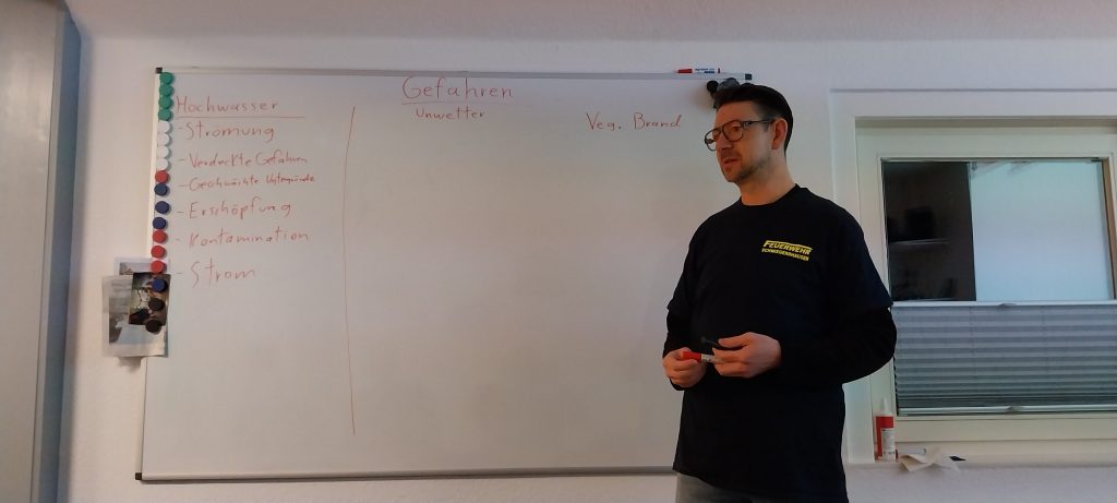 Das diesjährige Thema war „Sicherheit bei Extremwettereinsätzen“. Nach einem sehr anschaulichen Film der Feuerwehrunfallkasse (FUK) wurden diese in die drei Bereiche Hochwasser, Stürme und Vegetationsbrandbekämpfung unterteilt. Nun galt es, mögliche Szenarien zu jedem Bereich rauszuarbeiten, die verschiedenen Gefahren zu analysieren und vor allen Dingen auch herauszufinden, wie mit eben diesen Gefahren umzugehen ist.